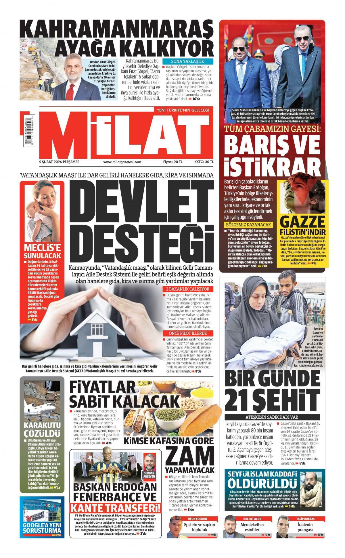 Milat Gazetesi 6 Şubat 2026 Günü Gazete Manşetleri